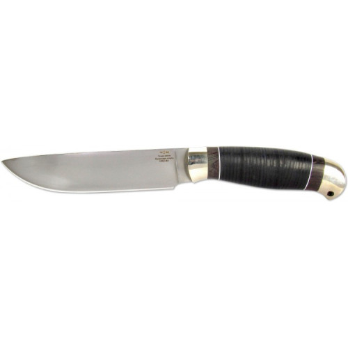 Рукоятка ножа удобно ложится в руку и обеспечивает высокий уровень безопасности при работе с ножом. При изготовлении рукояти использованы проставки из натуральной кожи, что обеспечивает максимальное удобство. Тыльник и оковка изготовлены из латунного сплава. Использование этих элементов придает ножу определенную статусность.