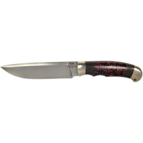 Рукоять ножа изготовлена наборным способом из полимера и дерева венге. Полимер имеет красивый объемный рисунок. Тыльник и оковка изготовлены из латунного сплава.