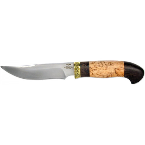 Рукоять ножа изготовлена из карельской березы и тропического дерева венге, литье – из латуни. Эргономичная рукоять обеспечивает крепкое и надежное удержание ножа, как при прямом, так и при обратном хвате. В комплекте с ножом поставляются удобные ножны, сделанные из прочной и толстой кожи.