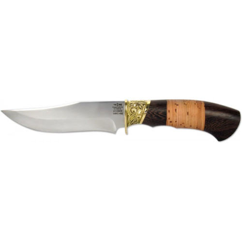 Чтобы рукоять была достойным продолжением кованого клинка, ее изготавливают из классических ножевых материалов: береста карельской березы и древесина венге. Рукоять украшена литой оковкой с одним упором. Материал - латунный сплав. Клинок ножа имеет зеркальную полировку.
