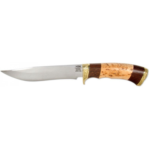 Рукоять изделия выполнена из натурального дерева — карельской березы. Она имеет особую форму, позволяющую удобно держать нож в руке. Дополнительно ручка декорирована художественным литьем латуни, что придает изделию особую роскошь и делает его богатым подарком для коллекционеров.