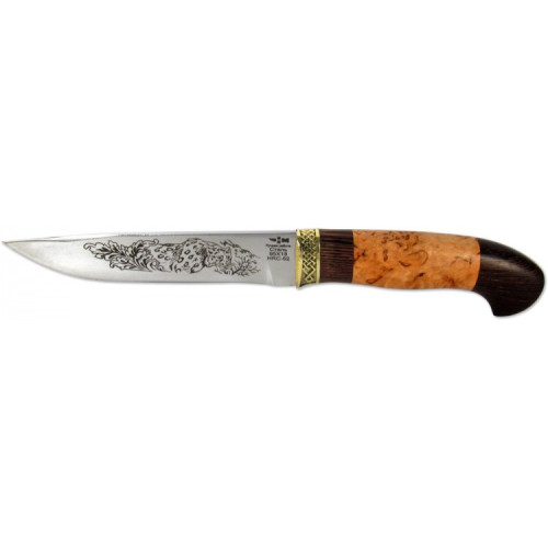 Нож нескладной КАПРАЛ из кованой стали производится на заводе в городе Ворсма, Нижегородской области. Особое внимание уделяется рукоятке изделия. Она выполнена из карельской березы и декорирована художественным литьем из латуни.