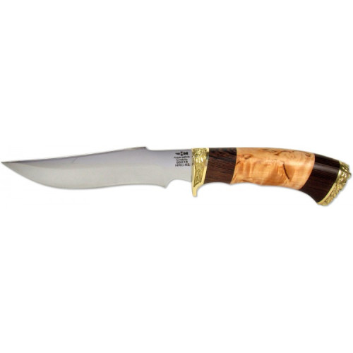 Рукоять режущего инструмента изготовлена из карельской березы, которая известна своими отличными эксплуатационными характеристиками. Эргономичная форма, уникальный дизайн, водонепроницаемость и стойкость к физическим деформациям являются основными преимуществами рукояти благородных оттенков. Охотничий нож комплектуется качественными кожаными ножнами классического черного цвета с золотистыми заклепками и прошивкой. Эстетическая привлекательность инструмента позволит отлично дополнить коллекцию истинных ценителей роскошных ножей. А учитывая, что изделие не относится к холодному оружию, то для его приобретения не требуется иметь специального разрешения.