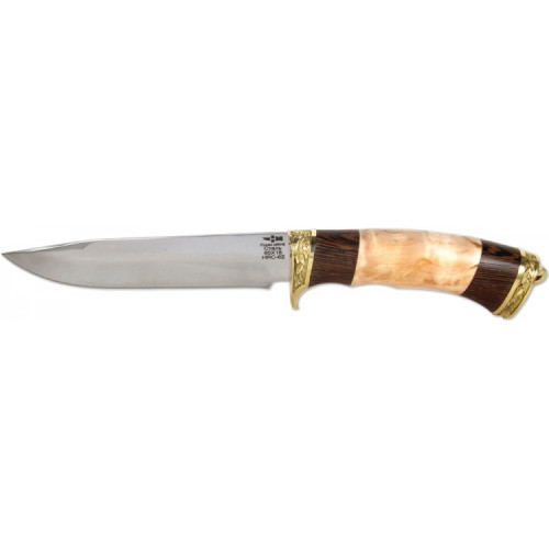 Основным украшением этого практичного снаряжения является оригинальная рукоять из древесины карельской березы. Латунная гарда, выполненная с помощью художественного литья, эффектно выглядит на фоне дерева и стали. Рукоять имеет удобную форму, плавные линии, идеально гладкую поверхность, поэтому даже при длительной работе ножом кожа рук не травмируется.