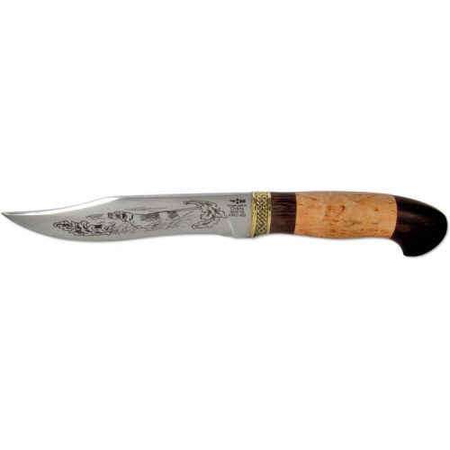 Нож КОМБАТ (4206)к изготовлен из кованой высоколегированной стали, усиленной армированием. Специальные волокна делают сталь марки 95х18 более прочной и износостойкой. Клинок из нее долго остается острым, редко требует заточки. Его длина — 15,5 см, а длина всего ножа – 28 см. Клинок украшен богатым изображением, которое делает снаряжение уникальным и роскошным. Рукоять изделия изготовлена из карельской березы, имеет красивую декоративную деталь из латуни, выполненную методом художественного литья. Весь дизайн ножа подчиняется одному стилю.