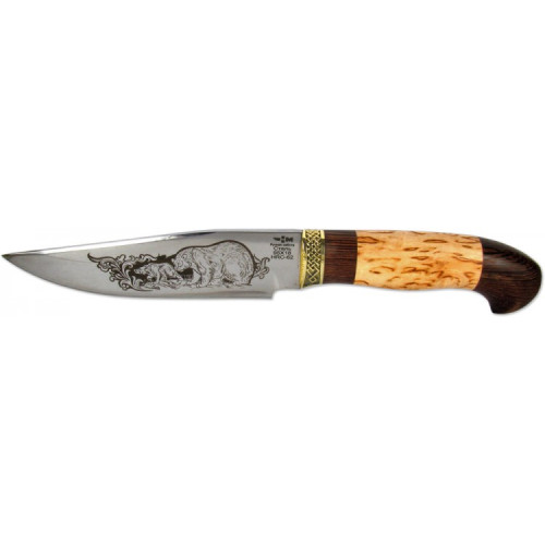 Изделие имеет роскошную рукоять из прочной карельской березы, украшенную художественным литьем. Удобная форма рукояти является большим преимуществом снаряжения, работать которым легко и удобно. Такое снаряжение выручит в любых ситуациях и станет незаменимым помощником для охотника, рыбака или туриста. С его помощью можно оперативно нарезать ветки для костра, расчистить дорогу в чащах, разделать рыбу или мясо.