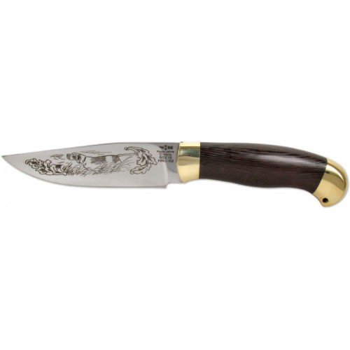 Рукоять изделия имеет слегка изогнутую форму, что позволяет легко использовать нож в деле: резать, разделывать, стругать. Рукоять изготовлена из благородной древесины венге, отличающейся прочностью и красивым оттенком. В качестве декора использовано художественное литье из латуни.
