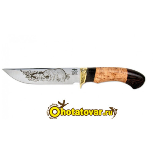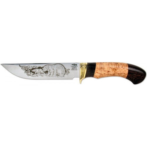 Нож ЛЕСНИК (6519)к имеет достаточно распространенный тип клинка «с прямым обухом» длиной 145 мм и толщиной лезвия — 2,4 мм. Характеристики такого лезвия отлично сбалансированы: хорошо режет и легко прокалывает. Дополнительно лезвие украшено роскошной гравировкой, искусно выполненной на его зеркальной поверхности.