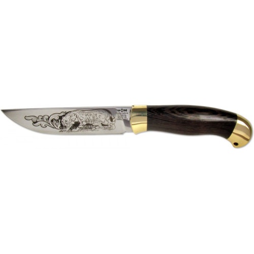 Нож имеет длину клинка — 126 мм при толщине 3,5 мм. Кованая сталь марки 95х18 стоит в ряду высокопрочных сталей, отличающихся устойчивостью к коррозии. Лезвие украшено гравировкой в виде хищного животного, что придает ему художественную ценность. Полированная поверхность клинка не требует особого ухода, нож достаточно промыть под струей воды и протереть сухой салфеткой, и он станет как новенький.