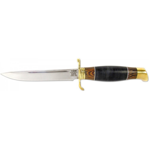 Рукоять ножа украшена декоративными литыми элементами: латунные гарда и тыльник. Основная часть рукояти выполнена наборным способом из натуральной кожи и древесины венге. Благодаря коже нож уверенно удерживается даже влажной рукой.