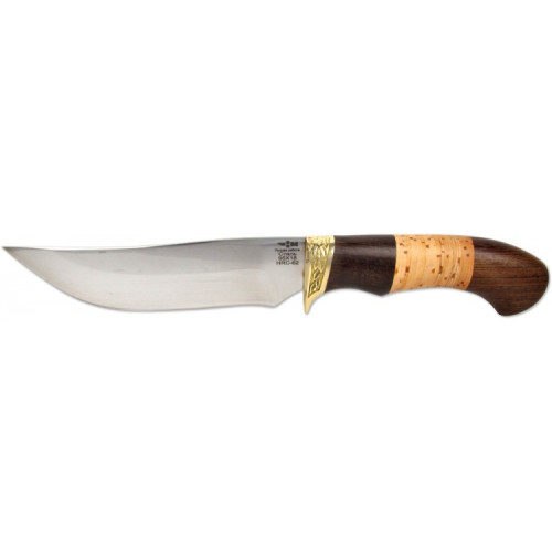 Рукоять ножа изготовлена из дерева венге, которое гармонично сочетается с берестой. Венге представляет собой экзотическую породу дерева, которая обладает необычной цветовой гаммой и уникальной текстурой. Дополнительно имеется вставка из латуни, придающая изделию особую роскошь и богатство.