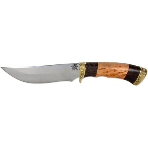 Рукоять ножа ОРЛАН выполнена из древесины карельской березы. Она имеет слегка изогнутую форму, что обеспечивает удобство во время использования. Рукоять украшает латунная гарда, выполненная методом художественного литья. Кроме прекрасных эстетических характеристик, она позволяет надежно фиксировать изделие в руке во время использования и надежно защитить руку от нечаянного пореза. Изделие комплектуется удобными кожаными ножнами, в которых оно надежно хранится и транспортируется.