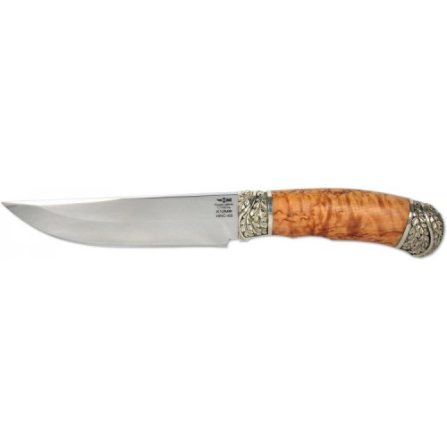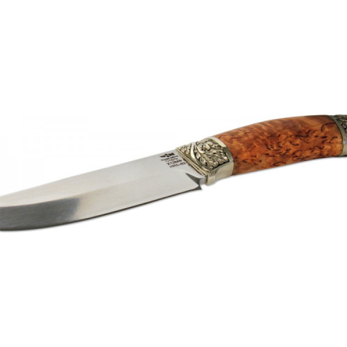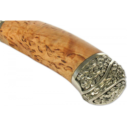 Важным элементом этого ножа является его рукоять, которая сразу же обращает на себя внимание. Удобная и ухватистая рукоятка выполнена из стабилизированной карельской березы - материала, надежность которого проверена временем. В качестве статусных элементов, нож украшен художественным литьём: оковка и тыльник из мельхиора с декоративным рифлением.