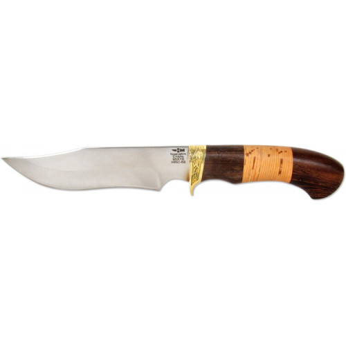 Прочная и удобная рукоять этой модели изготовлена наборным способом из древесины венге и бересты. Рукоять украшена декоративно оковкой с одним упором, изготовленной из латуни.
