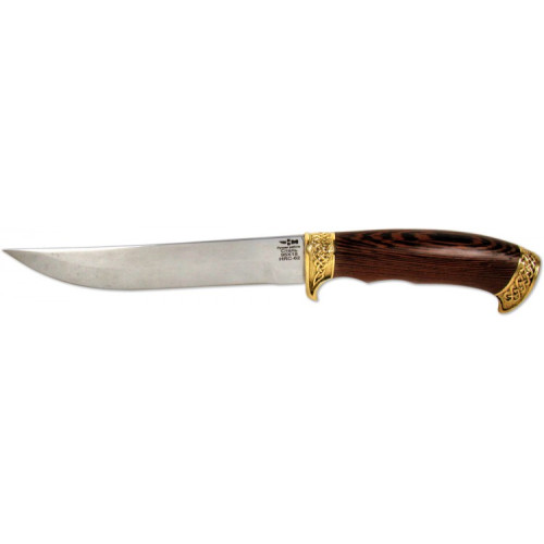 Особенную красоту ножу придают натуральное дерево венге и декоративные латунные элементы: оковка с одним упором и тыльник.