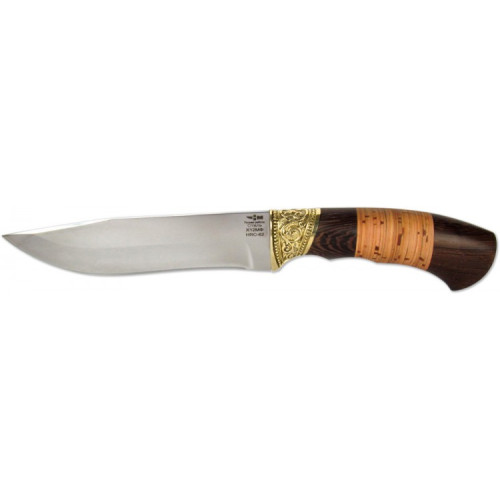 Рукоятка изготовлена из практичных и надежных материалов: береста карельской березы, дерево венге. Она надежно удерживается в руке за счет продуманной эргономики. Рукоять ножа украшена литым элементом - оковка с односторонним упором, изготовленным из латунного сплава.