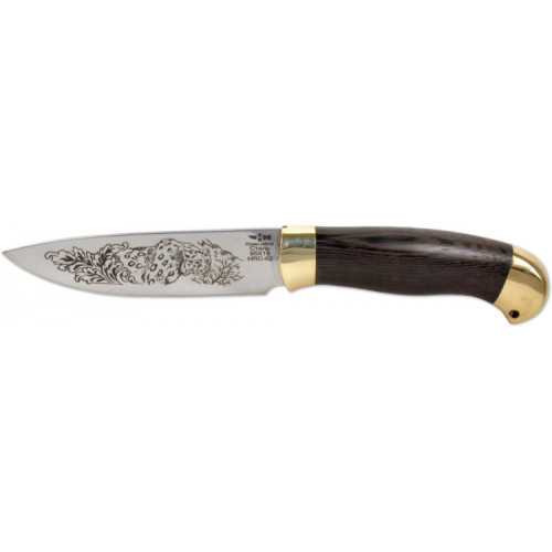 Клинок имеет удобную форму, подходящую для самого широкого спектра работ, а высокая прочность кованого лезвия станет гарантией того, что нож не повредится при частом использовании. Гравировка лезвия выполнена с помощью лазерной технологии, что гарантирует длительную стойкость изображения. Рукоять выполнена из дерева венге, обладающего прочной текстурой и насыщенным благородным цветом. Рукоять имеет вставки из отполированной латуни, придающей изделию особую роскошь и богатство. Общая длина ножа ВАРАН (7817)ксоставляет 248 миллиметров. Баланс между клинком и рукоятью выверен с точностью до миллиметра, благодаря чему использовать нож очень удобно.