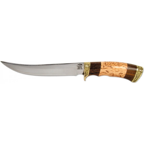 Рукоять данной модели обеспечивает надежную фиксацию ножа в ладони при выполнении любого типа работ. О рукоятке этого ножа стоит сказать отдельно. Она выполнена из ценных пород дерева и декорирована художественным литьем из латуни. За счет этого нож выглядит очень эффектно и дорого.