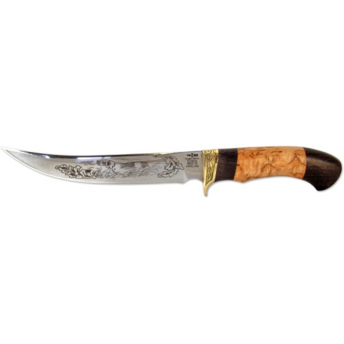 Нож ВОСТОЧНЫЙ (7743)к представляет собой отличный образец сочетания эргономичности и классической красоты свойственной восточным клинкам. Для производства лезвия используется высокопрочная, кованая сталь с показателями твердости 62 HRC, что гарантирует надежность лезвия, устойчивость и долговечность даже при интенсивном использовании. Длина клинка составляет 175 мм, общая длина с рукоятью — 300 мм. Толщина лезвия составляет 3 мм, лазерная заточка и полировка придают клинку зеркальный блеск и гладкость. Поверхность лезвия украшена тонкой гравировкой, изгиб лезвия придает ножу характерный восточный стиль. Рукоятка изготовлена из карельской березы, украшена латунью. Для безопасного хранения и переноски в комплект дополнительно входят ножны из натуральной кожи.