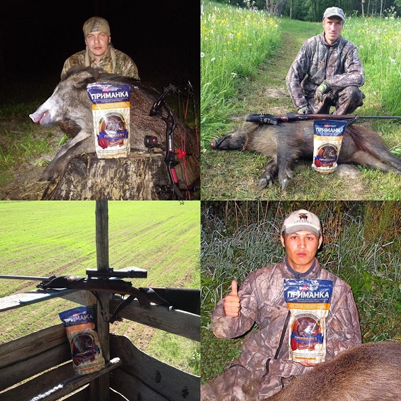 Охотничья приманка для животных на основе кукурузы с использованием вкусовых и ароматических веществ. Приманка применяется для привлечения кабана, лося, косули, медведя к месту предполагаемой охоты. Приманка обладает привлекательным для животных ароматом, который не только соблазняет зверя, но и заставляет находиться поблизости от кормушки длительное время. Приманка для охоты значительно увеличивает шансы удачной охоты, улучшает вкусовые качества и привлекательность предлагаемых зверю кормов. Использование приманки для охоты позволяет вводить в рационы животных корма с низкими вкусовыми качествами и неприятным запахом. Способствует приучению животных к потреблению разных видов кормов в определенное время. Приманка совместима с любыми кормами для животных, с другими кормовыми добавками и лекарственными средствами. Может применяться для привлечения кабанов, медведей, лосей, косуль, оленей, енотов, барсуков и др. Продукты жизнедеятельности животных после использования приманки можно использовать в качестве удобрений без ограничений. Приманка разбавляется любыми зерновыми и комбикормом, более эффективное и экономичное использование с автоматическими кормушками. Стойкий сладкий аромат приманки распространяется на большие расстояния.