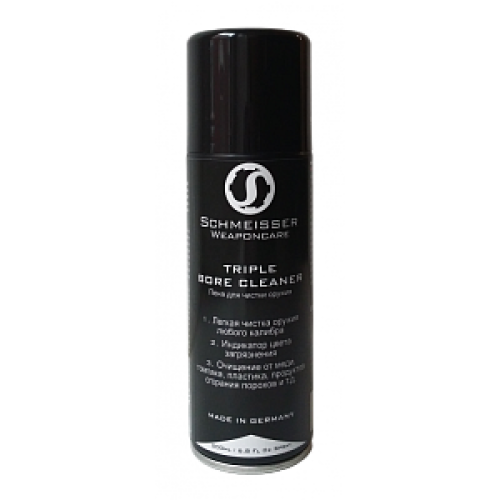 Schmeisser Triple Bore Cleaner - новейшее средство по очистке стволов огнестрельного оружия любого калибра! Пена для чистки ствола работает мягко и эффективно, без проблем удаляет остатки меди, томпака, свинца, продукты сгорания черного и нитро-порохов. Пена Triple Bore Cleaner абсолютно безопасна для оружия, не обладает неприятным запахом и не токсична. С помощью специальной насадки ствол полностью и равномерно наполняются белой, стабильной по форме очистительной пеной. Пена содержит вещества, которые реагируют на все загрязнения из меди и томпака, окрашиваясь в синий цвет.