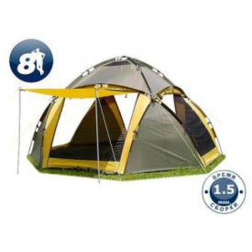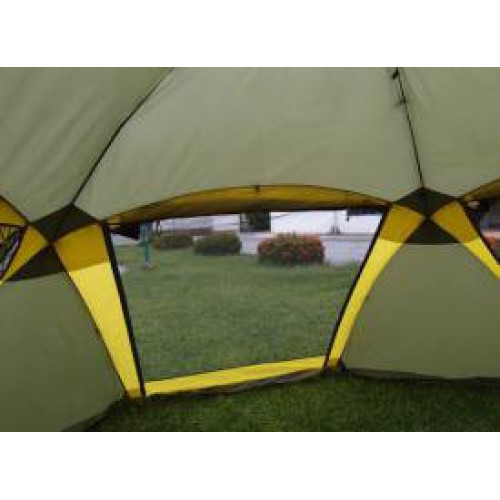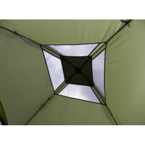 Основное предназначение шатра – комфортное пребывание на природе небольшой компании. Его размеры позволяют комфортно разместиться внутри группе из 6-8 человек. Причем его можно использовать как на кратковременных выездах (1-2 дня), так и при длительных походах. Конфигурация пола шатра представляет собой восьмиугольник. Шатер имеет четыре больших входа-двери. Каждая из них закрывается противомоскитной сеткой и сверху сетки дублируется дождезащитной стенкой. И сетки и стенки фиксируются по бокам застежками-«молниями». Основные отличия от предыдущей модели: добавлены в крыше тента, для улучшения вентиляции, 4 вентиляционных отверстия, закрытых для предотвращения попадания осадков внутрь защитным фартуком; отсутствуют 4 вентиляционных окна в боковых стенках.