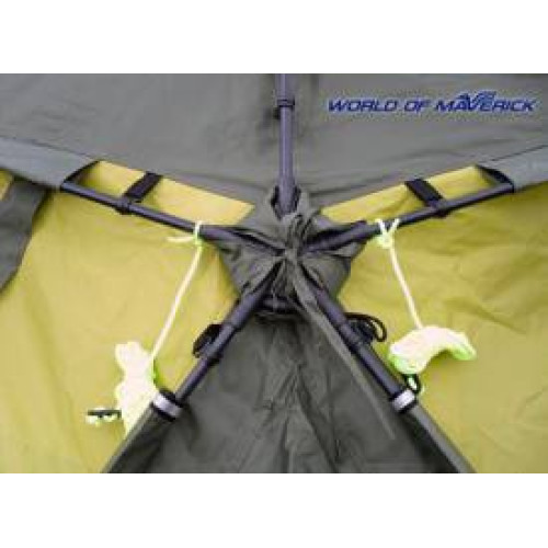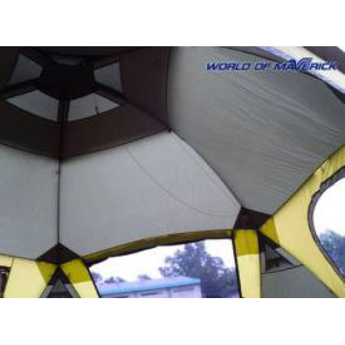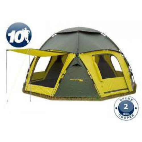 Основное предназначение шатра – комфортное пребывание на природе большой компании. Его размеры позволяют комфортно разместиться внутри группе из 8-10 человек. Причем его можно использовать как на кратковременных выездах (1-2 дня), так и при длительных походах. Конфигурация пола шатра представляет собой десятиугольник. Шатер имеет пять больших входов-дверей. Каждая из них закрывается противомоскитной сеткой и сверху сетки дублируется дождезащитной стенкой. И сетки и стенки фиксируются по бокам застежками-«молниями». Между каждым входом для улучшения вентиляции есть небольшое окно, которое так же снабжено противомоскиткой и дублируется дождезащитным клапаном на «молнии». Для улучшения вентиляции, в крыше шатра предусмотрены 5 вентиляционных отверстий противомоскитными сетками.