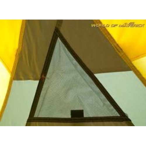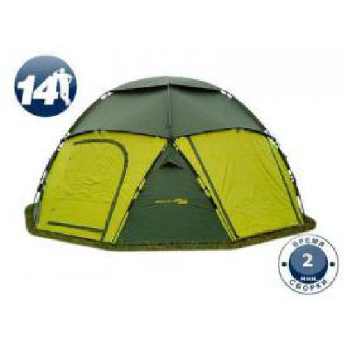 Выводит на новый уровень комфорта быт в туристическом лагере. Основное предназначение шатра – комфортное пребывание на природе большой компании. Его размеры позволяют комфортно разместиться внутри группе из 10-14 человек. Причем его можно использовать как на кратковременных выездах (1-2 дня), так и при длительных походах. Конфигурация пола шатра представляет собой десятиугольник. Шатер имеет пять больших входов-дверей. Каждая из них закрывается противомоскитной сеткой и сверху сетки дублируется дождезащитной стенкой. И сетки и стенки фиксируются по бокам застежками-«молниями». Между каждым входом для улучшения вентиляции есть небольшое окно, которое так же снабжено противомоскиткой и дублируется дождезащитным клапаном на «молнии». Для улучшения вентиляции, в крыше шатра предусмотрены 5 вентиляционных отверстий c противомоскитными сетками.
