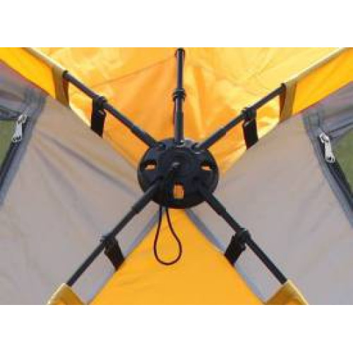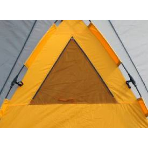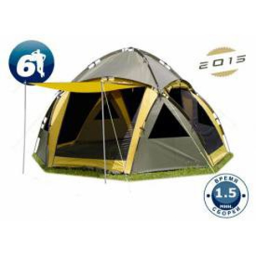 Основное предназначение шатра – комфортное пребывание на природе небольшой компании. Его размеры позволяют комфортно разместиться внутри группе из 6 человек. Причем его можно использовать как на кратковременных выездах (1-2 дня), так и при длительных походах. Конфигурация пола шатра представляет собой восьмиугольник. Шатер имеет четыре больших входа-двери. Каждая из них закрывается противомоскитной сеткой и сверху сетки дублируется ветрозащитной стенкой. И сетки и стенки фиксируются по бокам застежками-«молниями». Между каждым входом для улучшения вентиляции есть небольшое окно, которое так же снабжено противомоскиткой и дублируется ветрозащитным клапаном на молнии. Помимо летнего использования данная модель может использоваться и зимой, как базовая палатка, где можно собраться компанией и перекусить или отдохнуть от непогоды. Именно поэтому в куполе шатра отсутствуют вентиляционные отверстия.