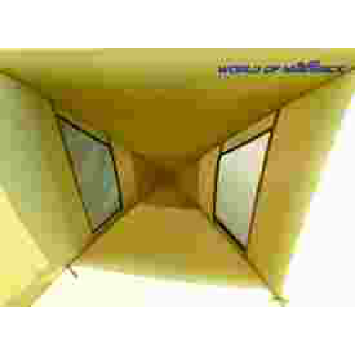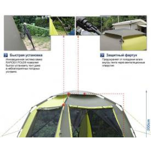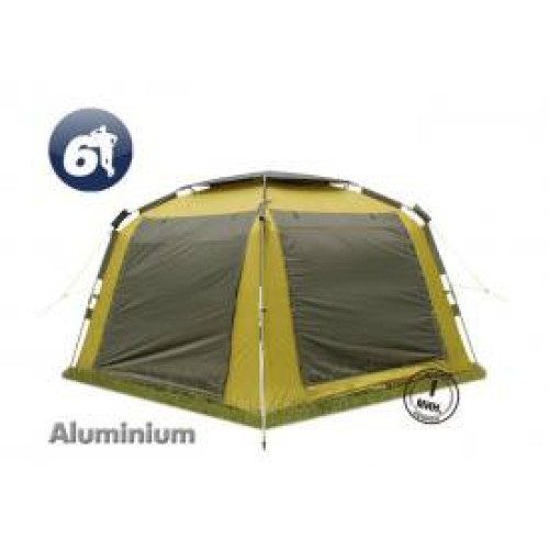 Это небольшой компактный шатер, рассчитан на комфортное использование для группы из четырех-шести человек. В основе шатра квадрат со стороной 3 метра.Шатер имеет два входа и два больших окна во всю стенку. Входы и окна закрываются москитными сетками и дублируются ветрозащитными стенками.В крыше шатра есть купольная вентиляция, которая закрывается защитным фартуком.