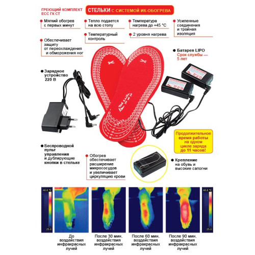 6. Температурный режим нагревания стельки: максимально + 45°С;