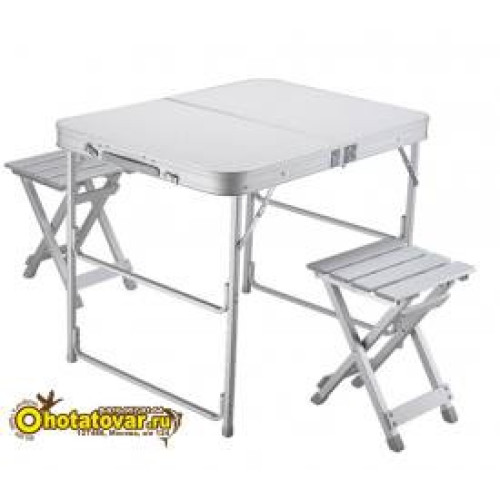 Набор из складного стола и двух стульев. Стулья складываются и убираются внутрь стола, который в собранном виде имеет форму чемодана. Пластиковое покрытие стола легко чистится и моется.