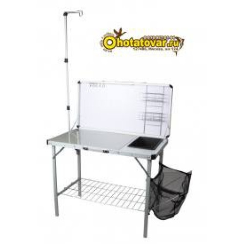 Складной туристический стол с раковиной. Просторная рабочая поверхность с минимойкой, полками для посуды и рейлингом с крючками для подвески столовых приборов. Корзина для сбора мусора, кронштейн для крепления лампы.