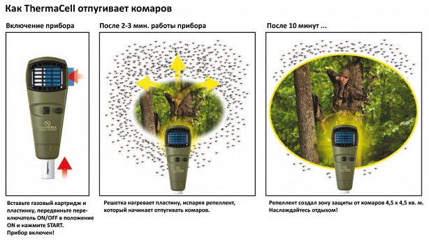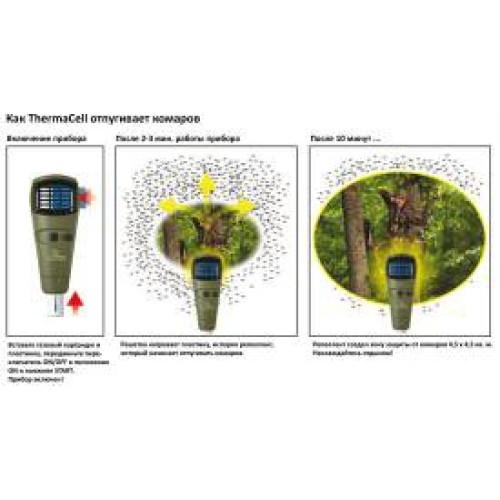 «ThermaCELL» отпугивает комаров, мошек (черные маленькие мошки), мокрецов (или одни из гнусов: кровососущие насекомые) и песчаных комаров.